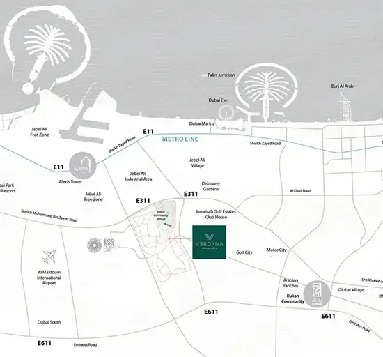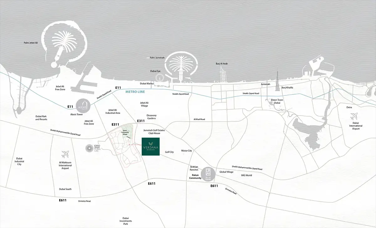 Verdana is well located in Dubai Investments Park, with an advantage of premium location map and connected to all the key areas of the city. Experience the convenience of being centrally located in Dubai, with access to all major city attractions. Nothing is out of reach from the world’s largest events hub EXPO City to the pristine beaches along Jumeirah Beach Road and The Walk with its attractive boutiques, shops, restaurants and cafes. Mall of the Emirates, Dubai Mall and numerous entertainment attractions including; IMG Worlds of Adventure, Global Village and Dubai Parks & Resorts are all in proximity to this prestigious community.